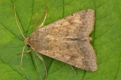 Newly hatched Helicoverpa armigera caterpillars are light in color, with small spots that become darker as the larvae develop. They also have lines along their bodies, a dark saddle-like protuberance on the fourth segment, and dark legs. Late-instar caterpillars have white hairs around their heads. You can find pupae in the soil beneath the crops. Adults have a wingspan of 30 to 45 mm. Females are brown to reddish brown, while males are opaque greenish to yellow or light brown. The hindwings are light in color and have a wide, dark outer margin with a small light spot.