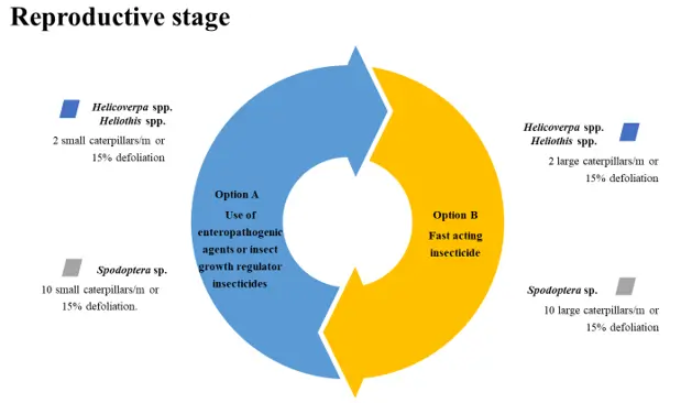 2. In the case of Helicoverpa, the first step is to check plant growth points within a 1 m space. Pest attacks start at the growth points, which are the preferred places for moths to lay eggs.