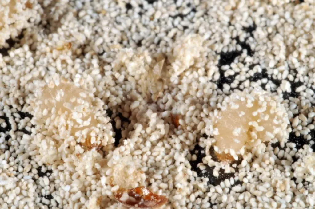 Tobacco beetles can reproduce as soon as they become adults. The eggs are pearl white in colour. In shape, they are oval with a slight swelling in the middle. One end of the egg has small, raised bumps. When freshly laid, the eggs are translucent, smooth and shiny.